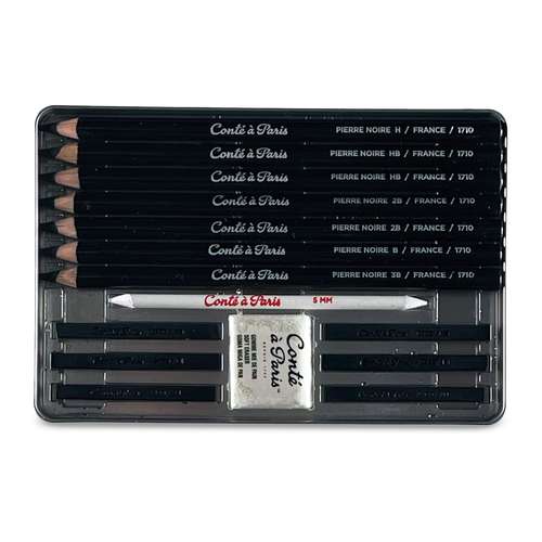 Découvrez l'art du croquis et du dessin avec ce coffret Pierre Noire 15 pièces de Conté à Paris™. Convient aussi bien aux professionnels qu'aux amateurs, il propose une sélection variée de crayons Oierre noire et de carrés Pierre noire permettant de créer une multitude de textures et d'ombres fines.
