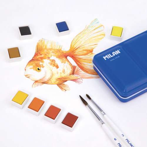 Coffret en métal de 12 ou 24 demi-godets d’aquarelle, dotée d'une palette rabattable et d’un anneau de maintien.