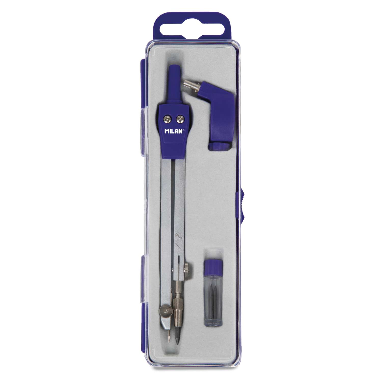 Chaque set est présenté dans une boîte plastique avec couvercle transparent, pratique pour le rangement et le transport. Ces compas font partie de la collection Acid de Milan®, une gamme de fournitures scolaires et de papeterie colorées, résistantes et modernes, disponibles en bleu, rose ou jaune.