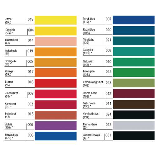 - jaune véritable, jaune ocre, vermillon, rouge carmin, violet, bleu outremer, bleu de Prusse, vert bleuâtre, vert jaune, Terre de sienne brûlée, noir.