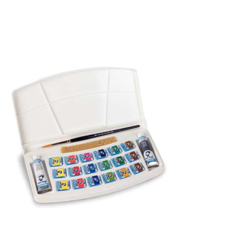 Ce coffret Van Gogh contient 18 demi-godets d'aquarelle Royal Talens, un pinceau en poils synthétiques, un tube de blanc de Chine, un tube de gris de Payne, une petite éponge ainsi qu'une notice d’utilisation.