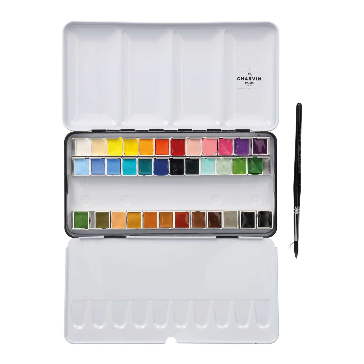 Le coffret d´aquarelles extra fines CHARVIN se compose de 36 demi-godets de couleurs différentes ainsi qu´un pinceau aquarelle en poils de martre rouge dans un coffret en métal.