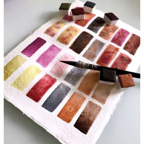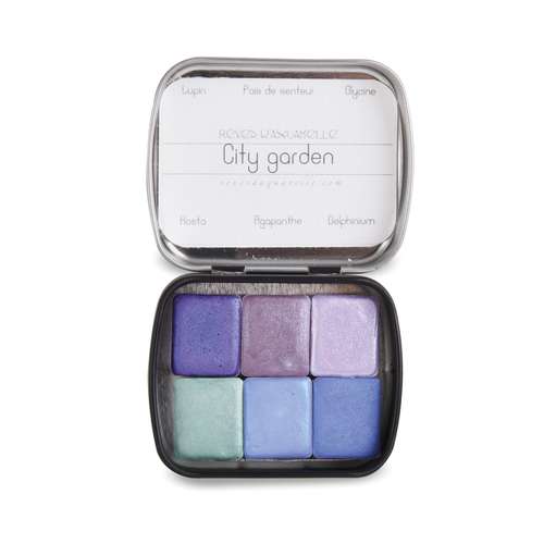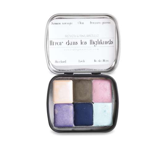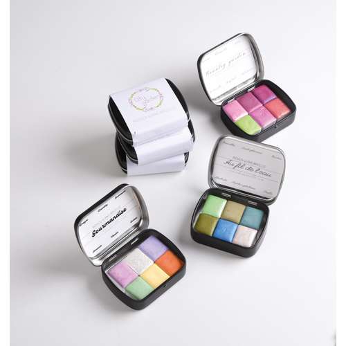 Certaines nuances sont nacrées au mica. Les harmonies des sets sont le fruit d’un long travail et se caractérisent par un jeu d’équilibre entre diverses intensités, luminosités et nuances afin d’enrichir et donner encore plus de caractère à la palette des couleurs proposées. Nous vous proposons une sélection de 6 coffrets de 6 nuances pour découvrir cette aquarelle originale.