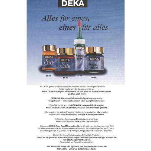 Découvrez ces couleurs pour soie Deka Silk, textile fin et tissu synthétique ! Les coloris DEKA-Silk peuvent être fixés au fer à repasser ou au micro-ondes.