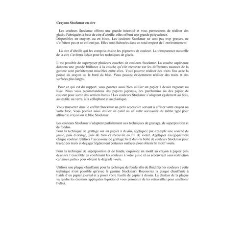 Les cires à colorier de STOCKMAR sont remarquables pour leur brillance. L´ajout de cire d´abeille et les pigments très purs en font des craies pour artistes. Elles s´utilisent sur tout matérial et répondent aux critères DIN EN 71, sont non dangeureuses pour la santé et l´environnement. Les cires à colorier plaisent aux enfants par leur forme, l'emballage attrayant et l'odeur agréable de cire d'abeille. Elles sont d´usage multiple : dessiner, peindre, supperposition de plusieurs couches, gratter, mélanger les couleurs : elles assurent des années de pur plaisir à céer.