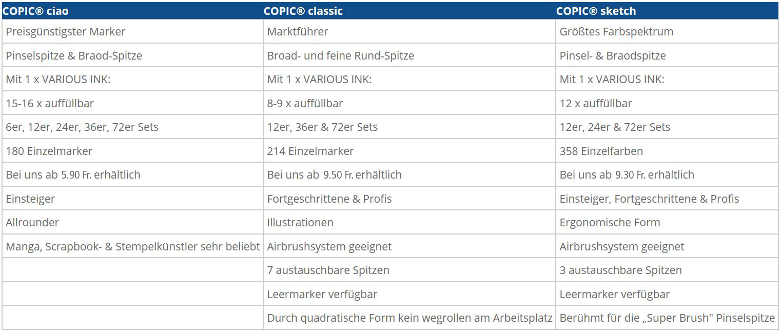 Ob Layouts, Kolorationen, schnelle Skizzen oder Entwürfe - für jede Grafikarbeit gibt es den passenden COPIC Marker. COPIC® ciao, classic oder sketch. Welcher Marker der richtige ist und worin sie sich unterscheiden, haben wir übersichtlich in einer Tabelle für Sie zusammengefasst.