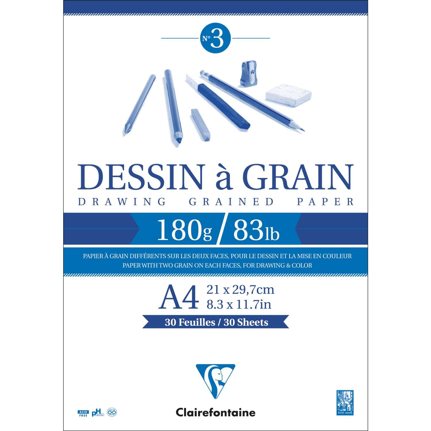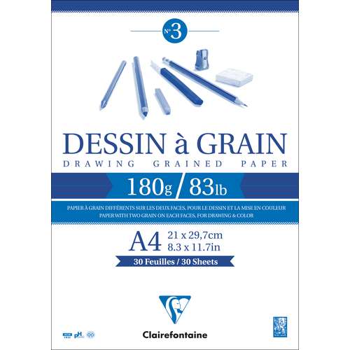 Bloc de dessin bleu CLAIRFONTAINE "Dessin à Grain", 180 g/m² contenant 30 feuilles. Bloc collé en tête. Papier blanc, sans acide, grain moyen, idéal pour le crayon, le pastel, l´encre ou le fusain. Son grammage convient par ailleurs aux techniques humides. Papier à grain différents sur les deux faces, pour le dessin et la mise en couleur.