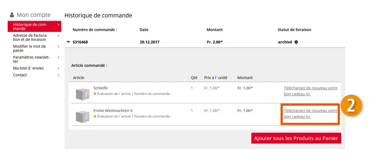 Connectez-vous à votre compte client. Vous trouverez le bon commandé sous le point Historique de commande et pourrez le télécharger. Imprimez-le ou envoyez-le par e-mail.