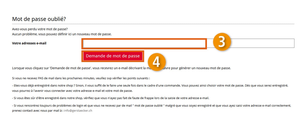 Assurez-vous de cliquer sur le bouton de connexion et de saisir vos données correctes. Si vous avez égaré le mot de passe, vous pouvez en demander un nouveau. Après avoir entré votre adresse e-mail dans le champ correspondant, vous recevrez un e-mail de notre part avec lequel vous pourrez effectuer les étapes nécessaires. Si l'e-mail ne vous parvient pas, vérifiez votre dossier spam.