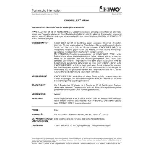 Ce produit imperméable Kiwofiller WR/01 sert de bouche-pores sur l´écran. Il est spécialement conçu pour l´impression d´encre sérigraphique à l´eau.