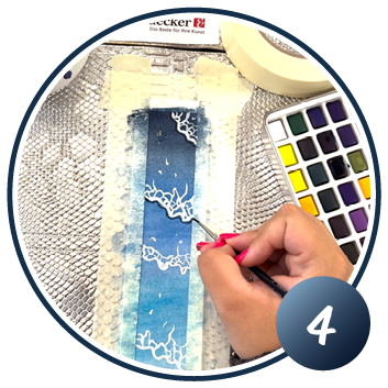 Mélangez de la peinture aquarelle blanche avec un peu d'eau jusqu'à ce qu'elle devienne opaque et brillante.Avec cette peinture, vous pouvez dessiner de délicates lignes ondulées, des éclaboussures ou des effets, créant ainsi de petits reflets sur ton fond bleu.