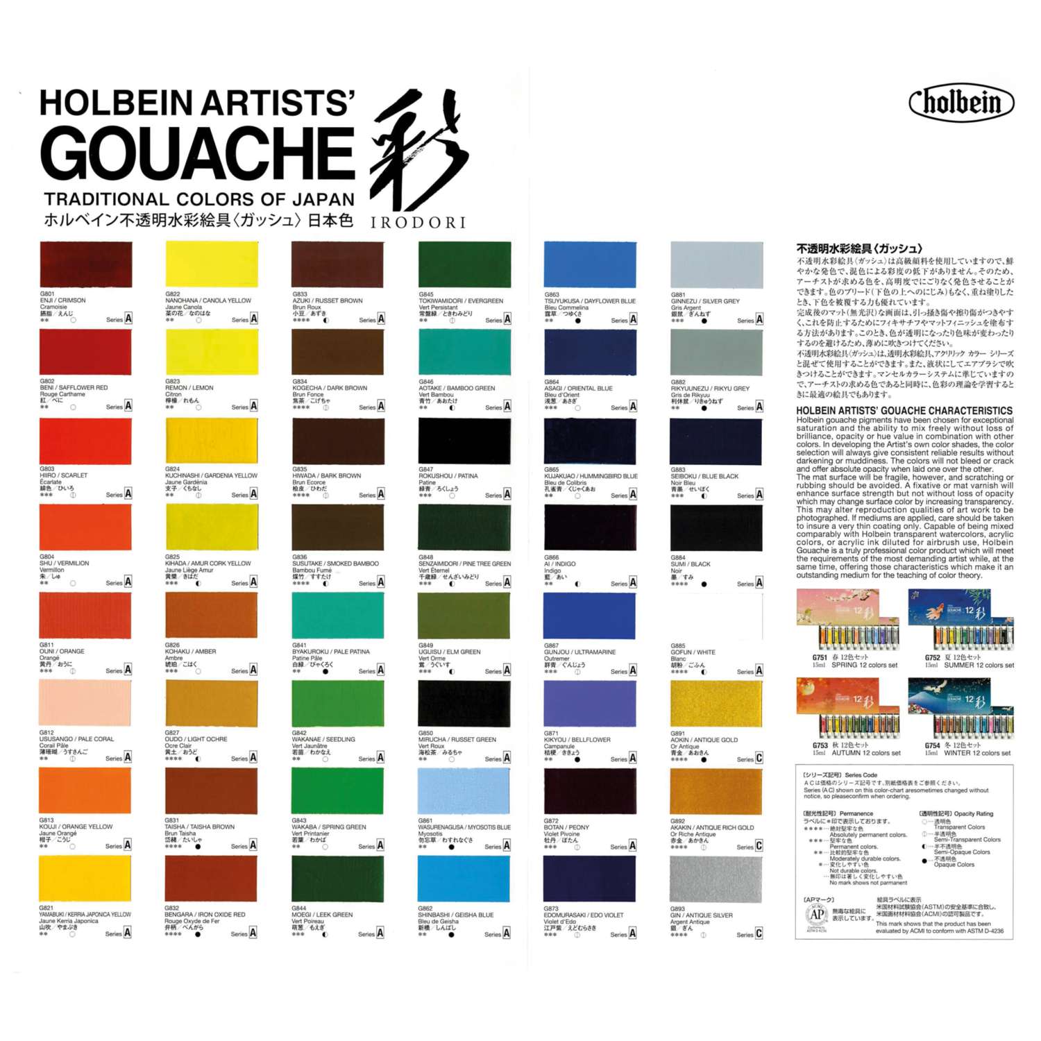 Ce nuancier présente les nuances des gouaches IRODORI HOLBEIN - des couleurs traditionnelles japonaises. Chaque nuance luit d´une brillance hors de l´ordinaire, d´une pigmentation saturée et d´une forte opacité. La palette de couleurs convient à tous ceux qui aiment les nuances fines au flair japonais.