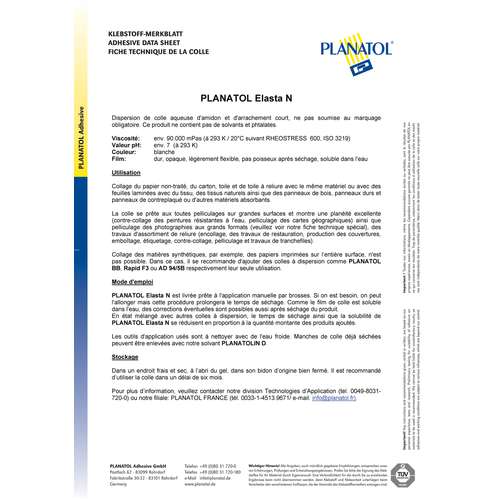 Le Planatol elasta est une colle à dispersion amidonnée est fabriquée à base de résine synthétique. Sans acide et d´une grande pérennité, elle ne contient pas de solvant et peut être diluée avec 30 % d´eau au maximum. Elle convient parfaitement aux travaux de reliure réalisés avec du matériel absorbant non-traité comme du papier, du carton, du lin et du calicot. Contrairement aux colles PLANATOL BB et PLANATOL AD 94/5 B, les assemblages confectionnés avec Elasta peuvent encore être dissous à l´eau. Il est vivement conseillé de rincer vos pinceaux et outils à l´eau après utilisation.