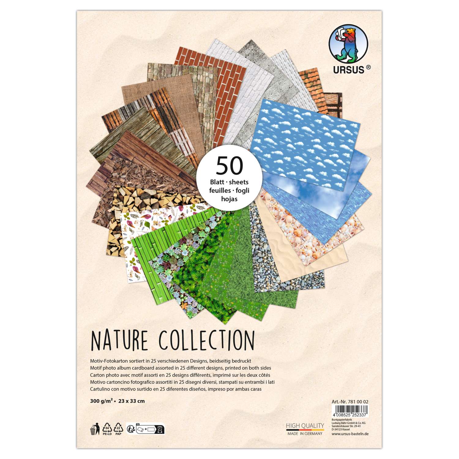Le Papier nature collection Ursus est conçu pour tous les passionnés de loisirs créatifs qui recherchent un matériau à la fois solide, élégant et durable. Ce carton photo premium, imprimé recto verso, propose 25 motifs naturels aux détails riches et réalistes : végétation, textures organiques, bois, feuilles, paysages et bien plus encore.