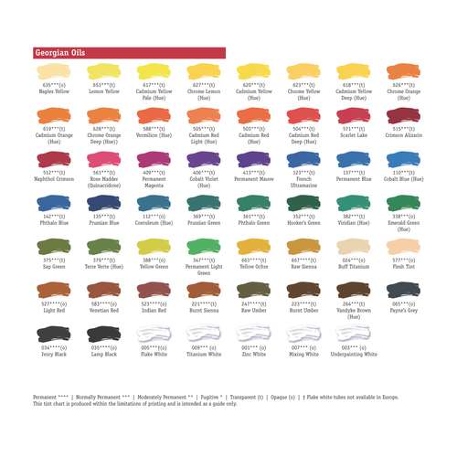Les nuances d’huile Georgian sont disponibles en tubes de 38 ml, 75 ml et 225 ml.