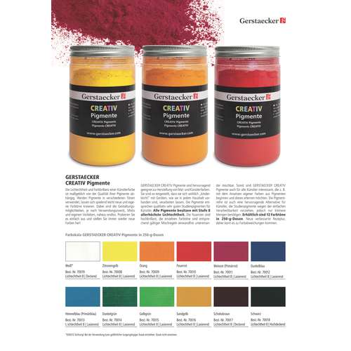 Destinés avant tout aux enfants, les pigments CREATIV de Gerstaecker ne contiennent aucune matière nocive et permettront aux artistes en herbe de fabriquer leurs propres couleurs ou teinter des matières sans aucune crainte. Ces pigments spéciaux leur permettront même de réaliser des couleurs, peinture à doigt, des pâtes à modeler et pâtes de modelage. L'utilisation des pigments CREATIV est d'une grande simplicité et vos enfants pourront rapidement les maîtriser. Les pigments CREATIV correspondent à des pigments pour artistes de qualité étude et sont aussi destinés aux artistes. Leur résistance à la lumière est maximale (niveau 8), les nuances sont brillantes et miscibles entre elles. Les enfants peuvent l´utiliser à l'extérieur.