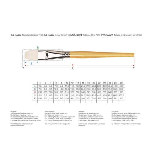 Pinceau DA VINCI MAESTRO, série 7100, plat pour l´huile et l´acrylique. Pointe en soie de porc se composant des poils de longueur moyenne de la colonne vertébrale du cochon. 2 liasses de poils de même épaisseur, courbées naturellement placées l´une contre l´autre, garantissent au pinceau MAESTRO une grande élasticité et une bonne absorbtion de la couleur.