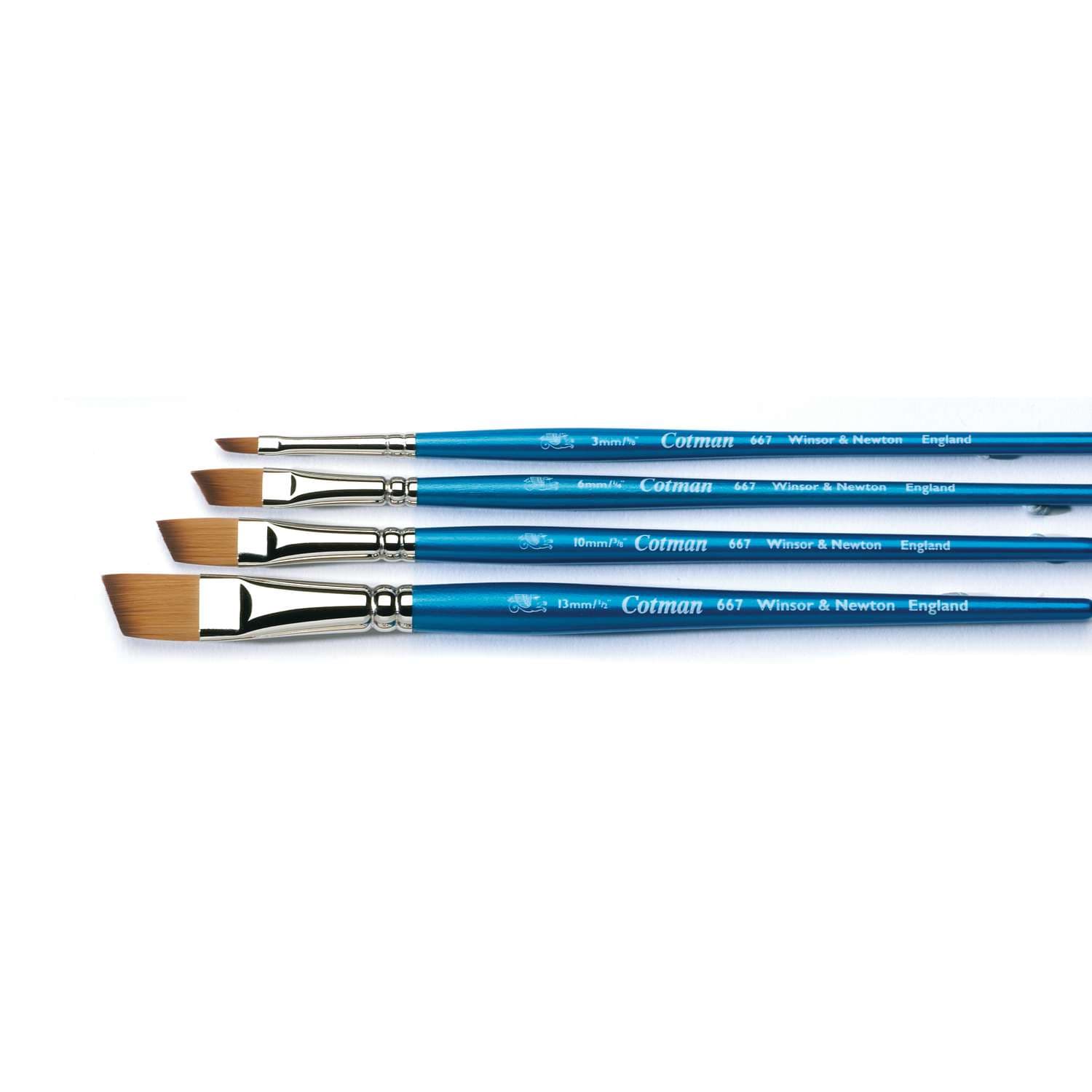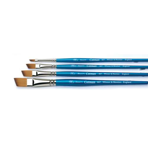 Pinceau biseauté WINSOR & NEWTON Cotman, série 667 en fibres synthétiques d´ épaisseurs différentes. Les fibres ont une excellente élasticité, une prise de couleurs parfaite (travailler sans avoir besoin de recharger le pinceau de peinture) et permettent une précision excate. Idéal pour l´aquarelle.