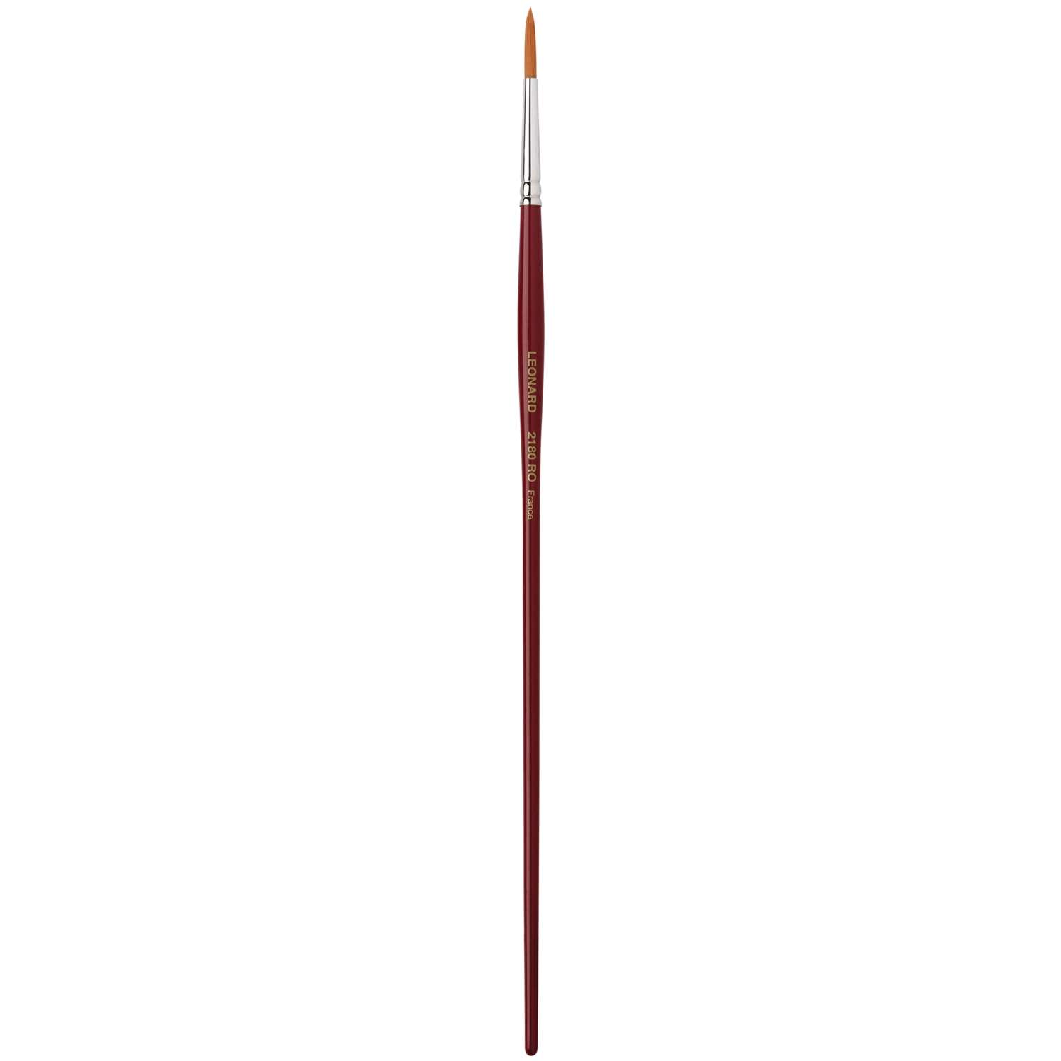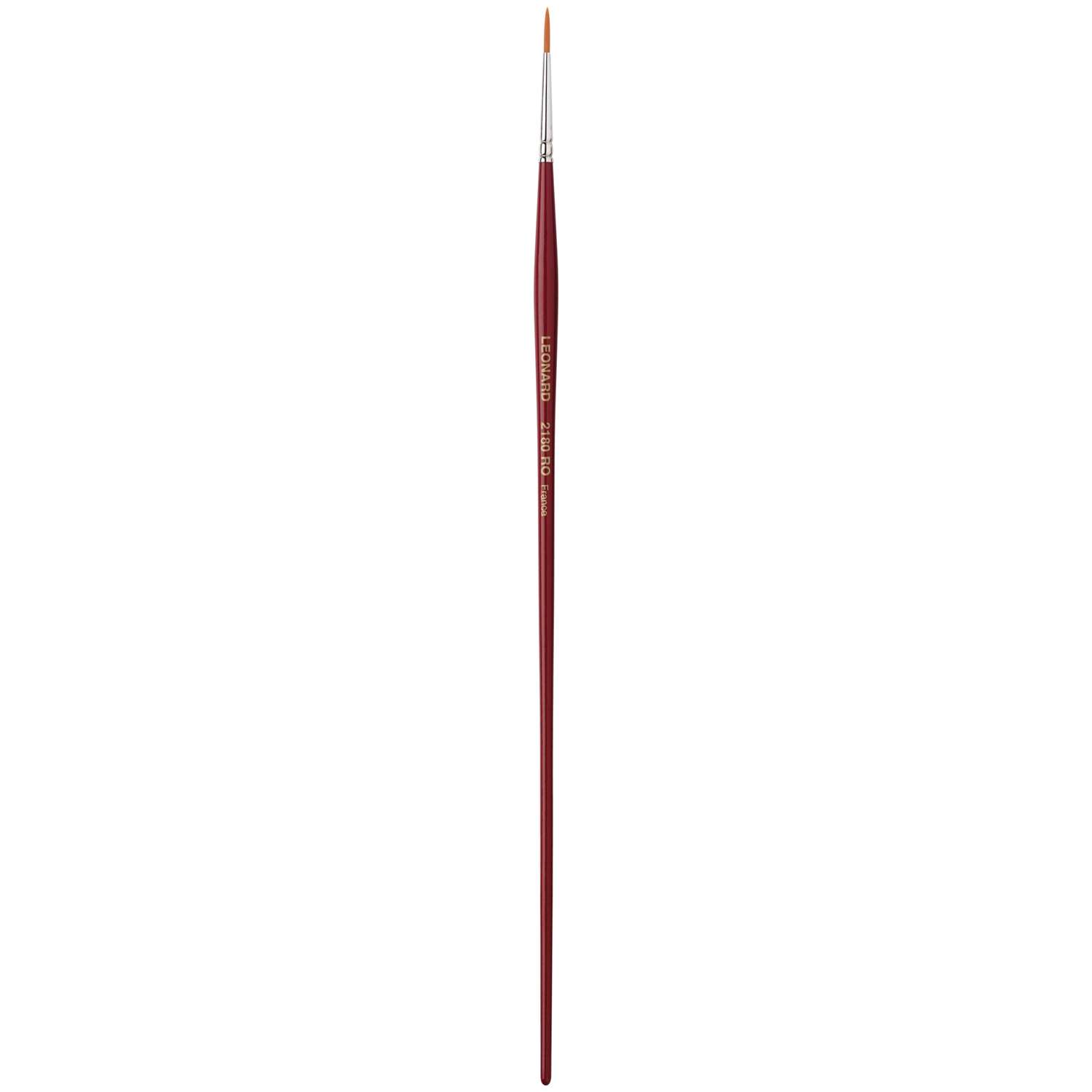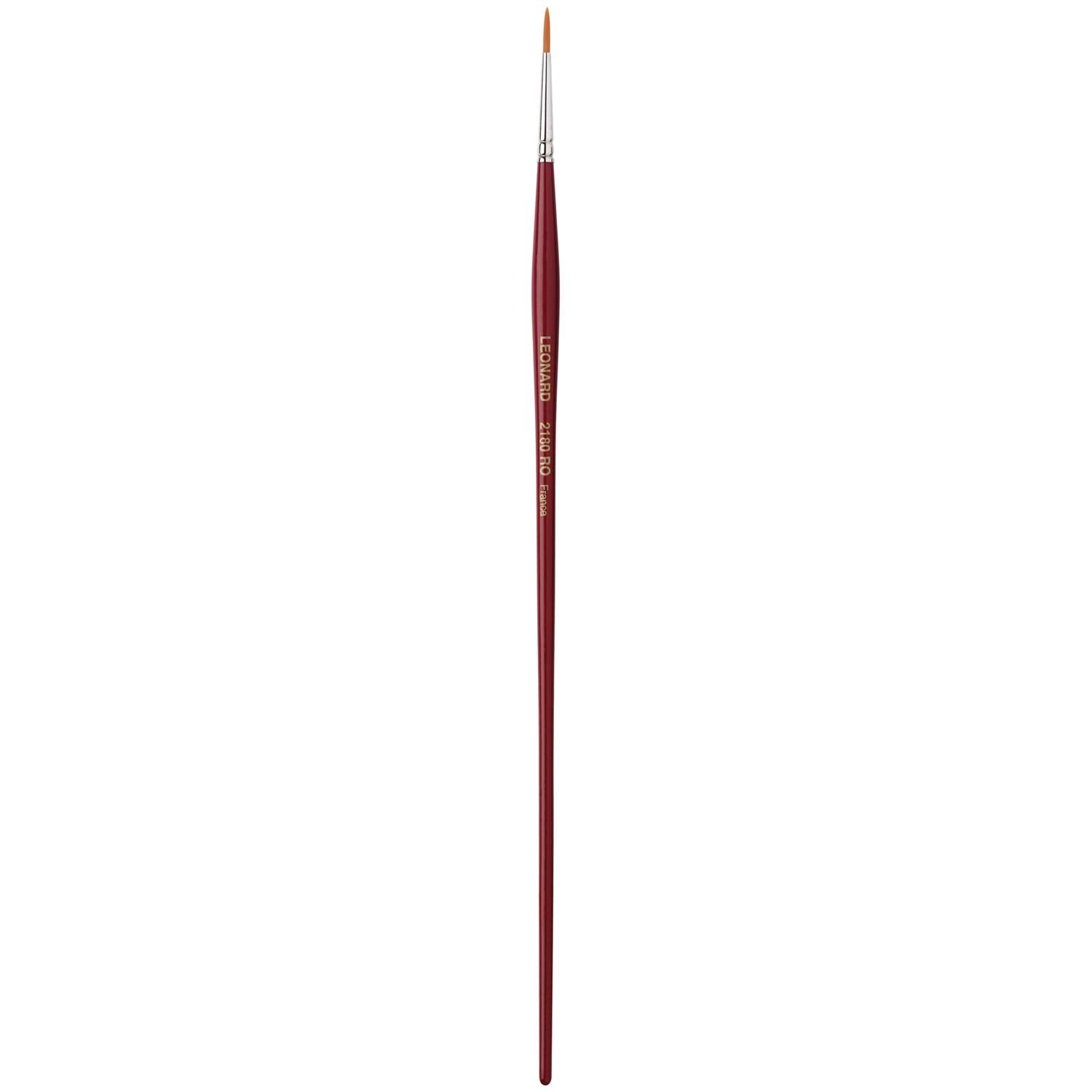 Pinceau Léonard série 2180 RO, pointe ronde, en fibres synthétiques dorées (0,10 mm). Virole argentée sans soudure, manche long verni rouge. Idéal pour les détails, contours, retouches, finitions. 12 tailles au choix.
