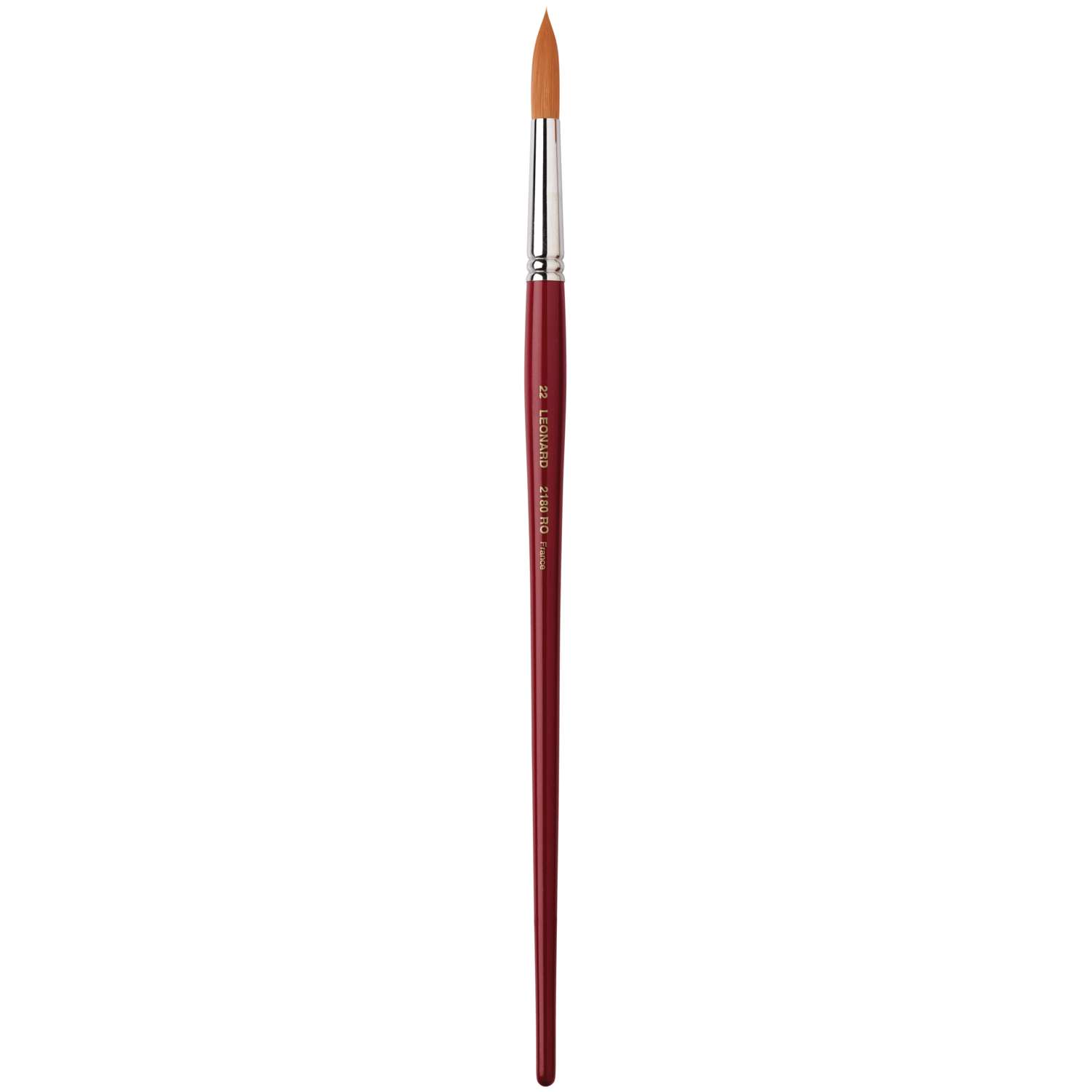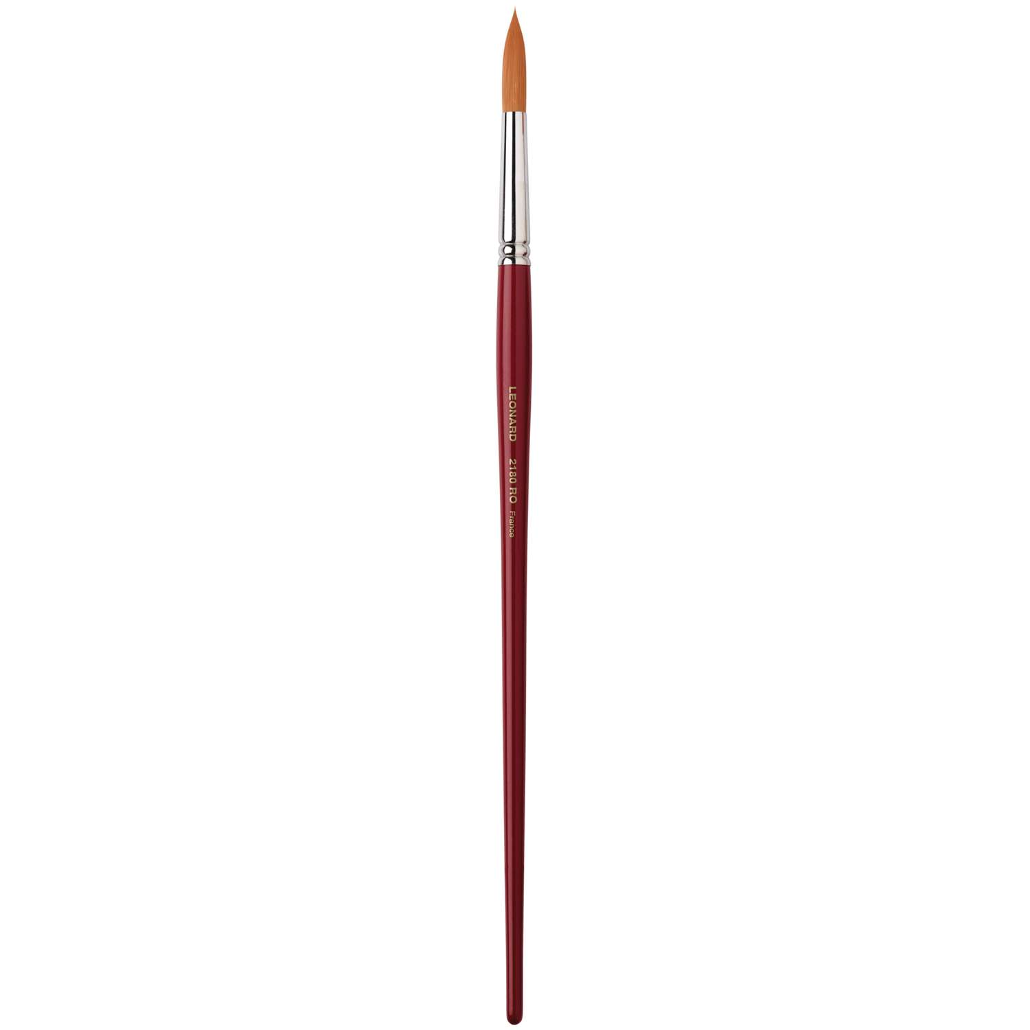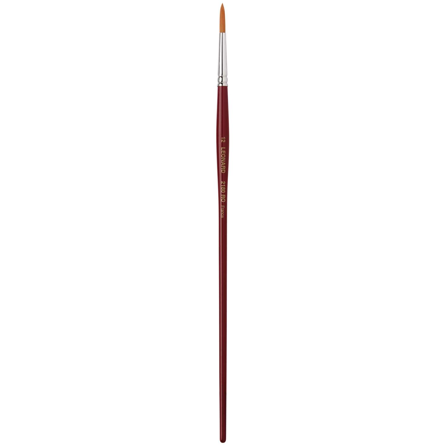 Pinceau Léonard série 2180 RO, pointe ronde, en fibres synthétiques dorées (0,10 mm). Virole argentée sans soudure, manche long verni rouge. Idéal pour les détails, contours, retouches, finitions. 12 tailles au choix.