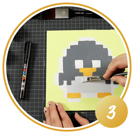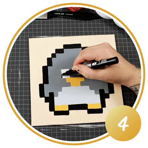 Après le séchage complet de la peinture, les outlines marqués sont maintenant entourés et peints avec un marqueur acrylique noir. Les marqueurs sont très couvrants et permettent de travailler les bords plus proprement qu'avec un pinceau. C'est ainsi que l'on obtient sa propre œuvre d'art dans toute sa puissance de pixels !