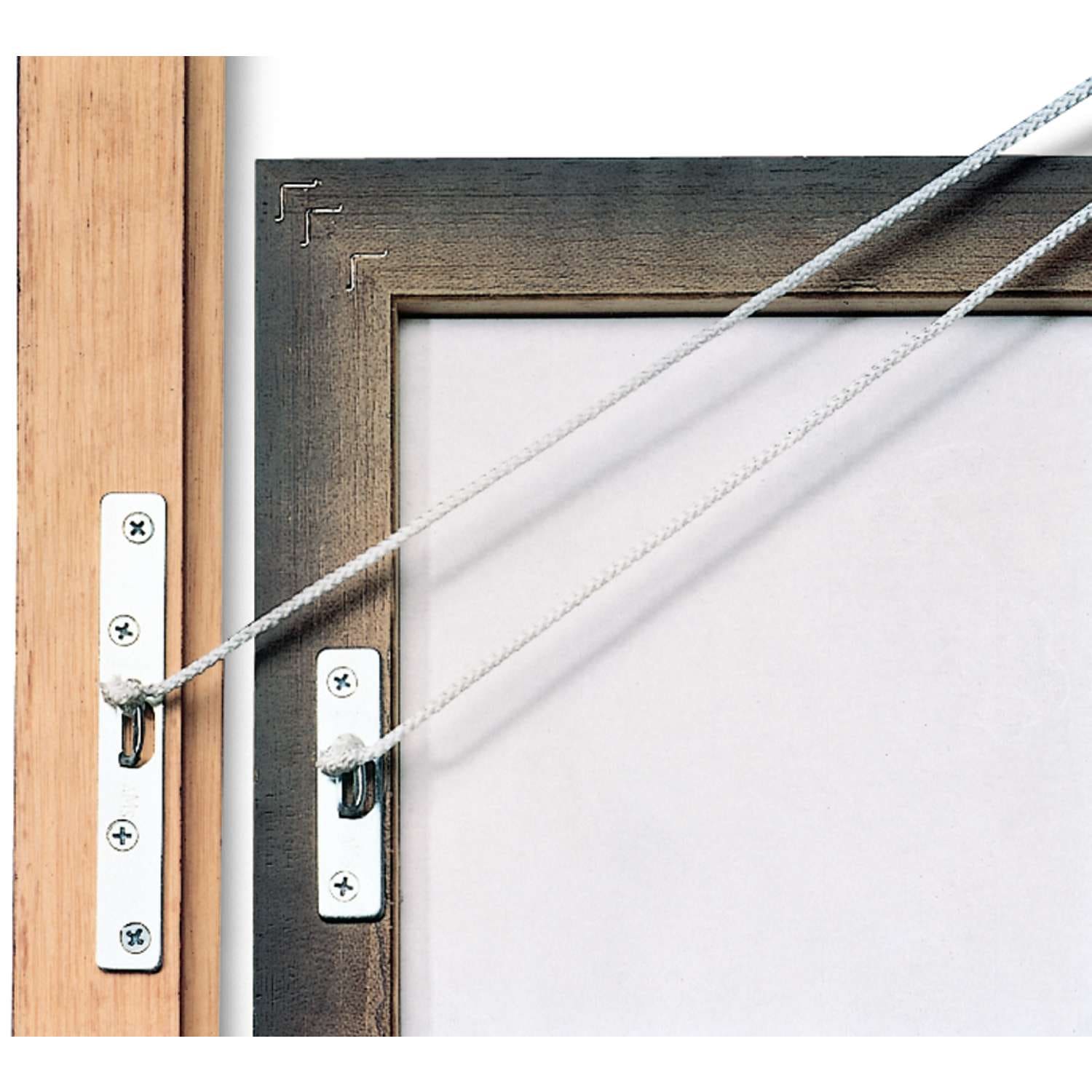 Lot de 2 plaques. Ces plaques d'attaches en zinc avec trous de fixation se vissent au dos du cadre, sur les côtés droit et gauche. Ensuite, il suffit de passer le cordon de suspension en perlon tressé dans les oeillets et de l'y nouer. Il s'agit d'un système de fixation extrèmement résistant. Les vis sont fournies.