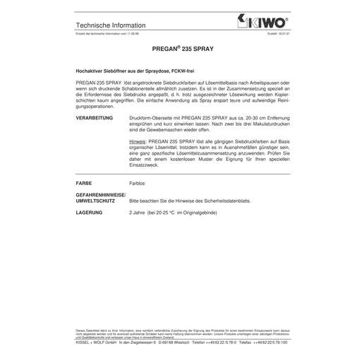 Pregan 235 S Aérosol nettoyant encre pour sérigraphie