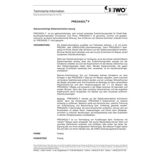Pregasol F Solution de nettoyage prête à l’emploi pour éliminer les résidus sur l’écran. Il est inodore, sans chlore et non corrosif.