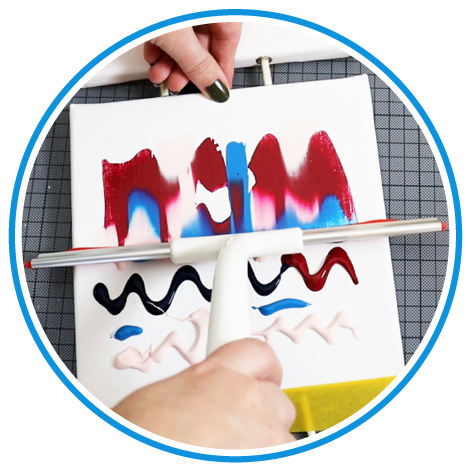 Différents résultats peuvent être créés avec la même procédure. Essayez d'appliquer la peinture acrylique en une ligne ondulée et tirez la raclette sur la toile. Des motifs passionnants et abstraits sont ainsi créés ! S'il reste beaucoup de peinture sur la raclette, vous pouvez facultativement à nouveau faire glisser l'outil sur l'image.