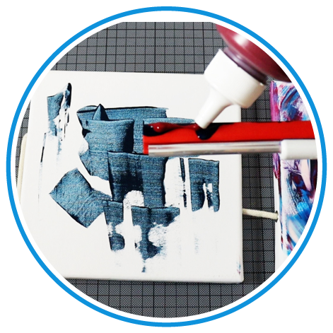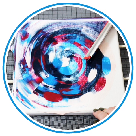 Une autre possibilité est le cercle avec un bel effet de profondeur. Répartissez également quelques gouttes de peinture au hasard sur la toile. Une des extrémités de la raclette est placée au milieu du châssis, et un cercle est formé au travers de la peinture avec un certain élan.