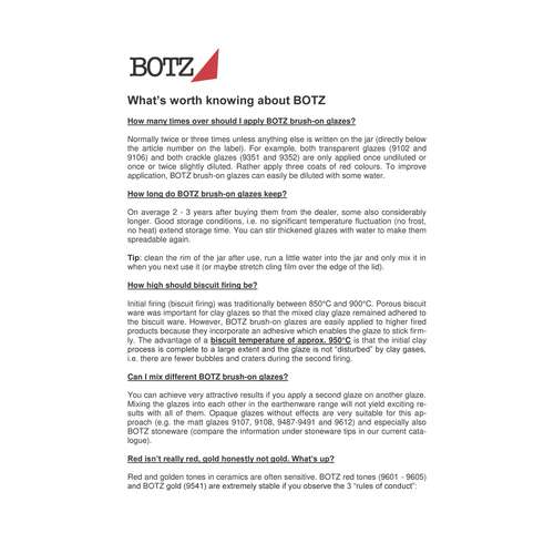 Pour la peinture sur porcelaine, ne pas appliquer une couche trop fine lors de la décoration de la porcelaine, cuire à 1200 °C minimum ou émailler en couche fine avec un émail transparent et cuire à 1080 °C. À l'exception des couleurs 003, 005 et 015, UNIDEKOR® devient également très intense sur le grès à plus de 1220 °C. Les carreaux de terre cuite ou les carreaux achetés (demander la zone de cuisson !) conviennent parfaitement pour être peints. Appliquer et cuire à environ 1050 °C dans la cuisson d'émaillage. La technique de l'émaillage sous couverte permet de décorer de manière très esthétique des céramiques non émaillées ou des carreaux de biscuit. Peindre les couleurs légèrement diluées à la manière d'une aquarelle, placer éventuellement d'autres accents de couleur par-dessus, appliquer après le séchage une très fine couche de transparent avec un pinceau doux et cuire à 1050 °C. Appliquer un décor en surface avec un pinceau doux et émailler avec Transparent. Après le séchage, lisser les éventuelles bulles avec le doigt. Dans la technique de la majolique, de beaux effets sont obtenus grâce à la particularité de certains émaux. BOTZ UNIDEKOR® n'est pas soumis à l'obligation de marquage !