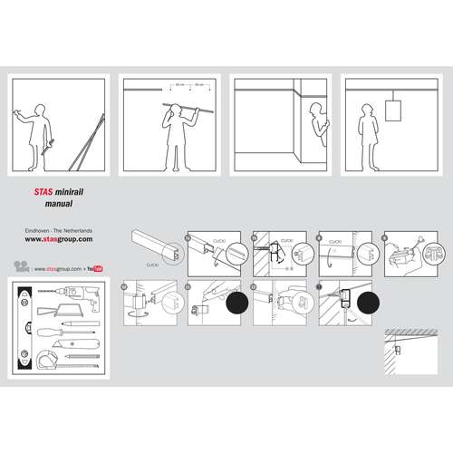 Le minirail a une hauteur de 16 mm seulement mais une capacité de charge allant jusqu`à 25 kg par mètre linéaire. Le rail s´accroche facilement au mur grâce à la vis révolutionnaire de STAS, la clipscrew.