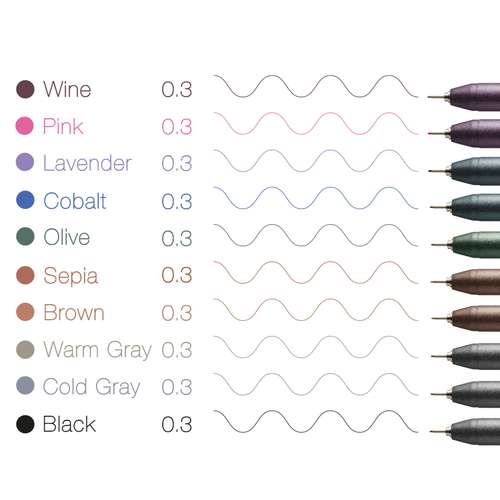 Le coffret contient 10 tailles de pointes : 0.03, 0.05, 0.1, 0.2, 0.3, 0.5, 0.7, 0.8, 1.0 mm, ainsi qu’un brush pen (pointe pinceau), pour un maximum de créativité.