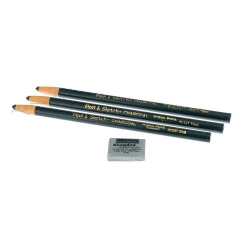 Contenu du set : 3 crayons fusains Peel & Sketch de duretés différentes et une gomme.