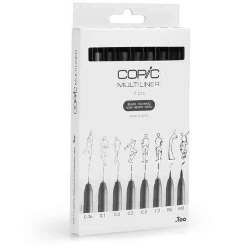 Ce merveilleux outil de travail est idéal pour vos ébauches, vos esquisses, vos illustrations ainsi que pour vos œuvres aérographiques, et ce aussi bien dans le domaine des arts graphiques, l´illustration, le design industriel que celui de l´architecture. Vous pouvez photocopier sans problème vos dessins réalisés avec les feutres COPIC multi liner très résistant et indélébile. Il est tout à fait possible de repasser plusieurs fois sur le même trait: le trait initial demeure tout aussi intense et l´encre ne coule pas. L´encre résiste parfaitement aux UV et les couleurs ne pâlissent pas. Nous vous proposons un assortiment de 8 feutres COPIC Multi Liner avec 6 largeurs et deux formes de pointes différentes.