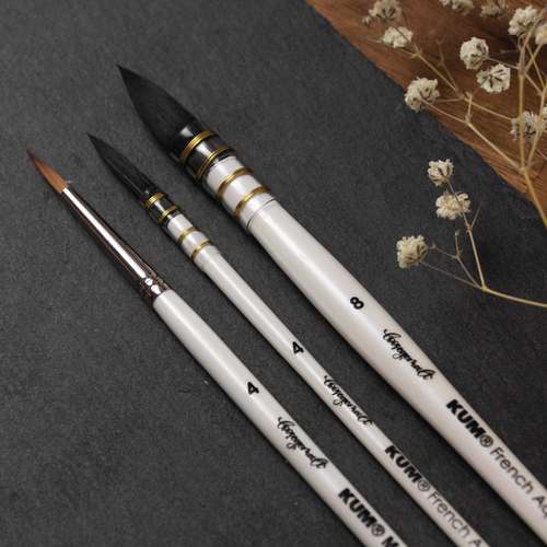Le Set de pinceaux aquarelle KUM® Loose Painting a été spécialement conçu pour la peinture aquarelle libre et expressive. Il comprend deux pinceaux French Aqua Wash (tailles 4 et 8) ainsi qu’un pinceau rond Memory Point (taille 4) – la combinaison parfaite pour des coups de pinceau spontanés et une peinture intuitive, sans recherche de perfection.
