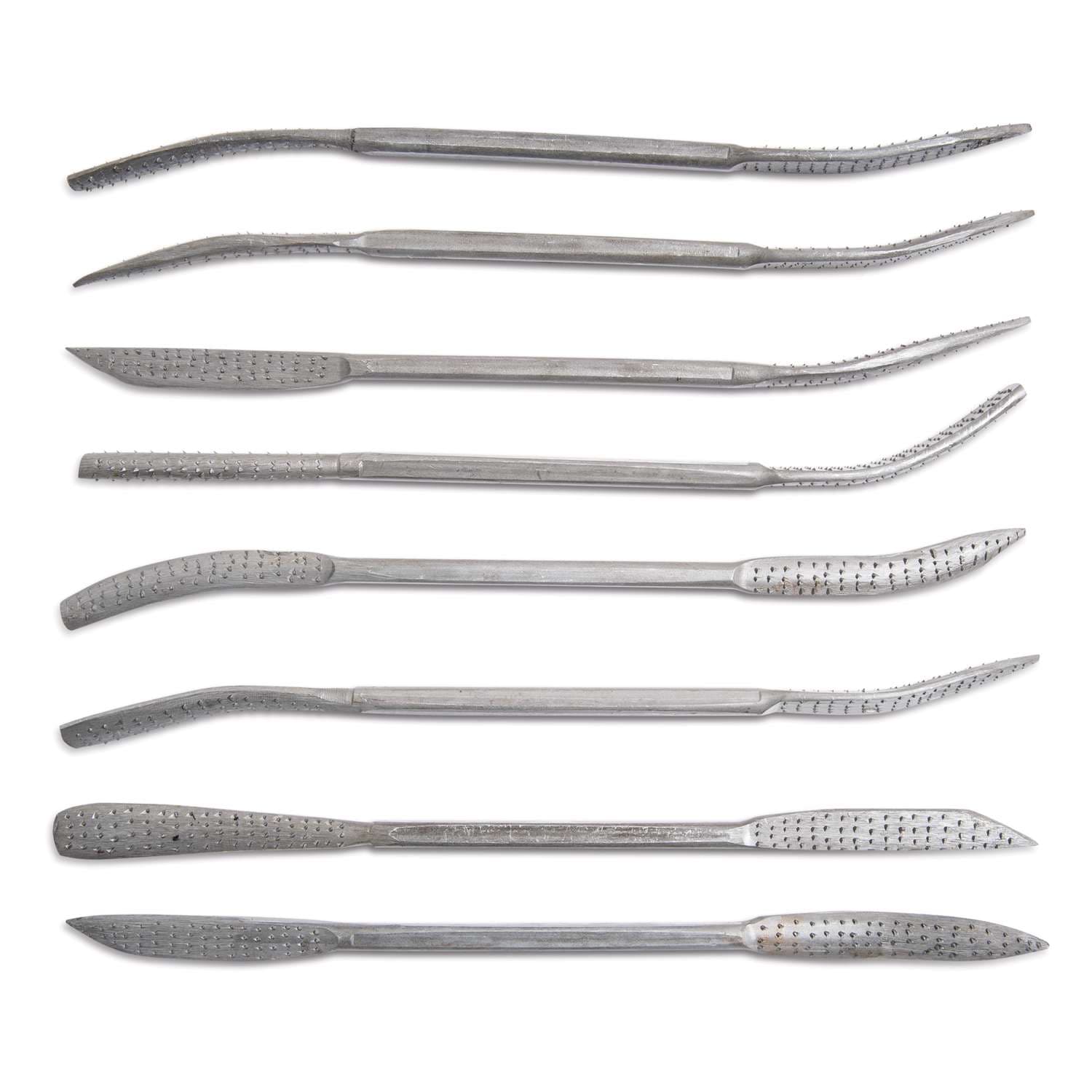 Le set de rifloirs "L" contient 8 rifloirs de qualité étude de différentes formes. Longueur moyenne des rifloirs : 25 cm. Les extrémités de chaque rifloir présentent des formes différentes. Ils conviennent parfaitement pour le travail de blocs de stéatites de grande taille.