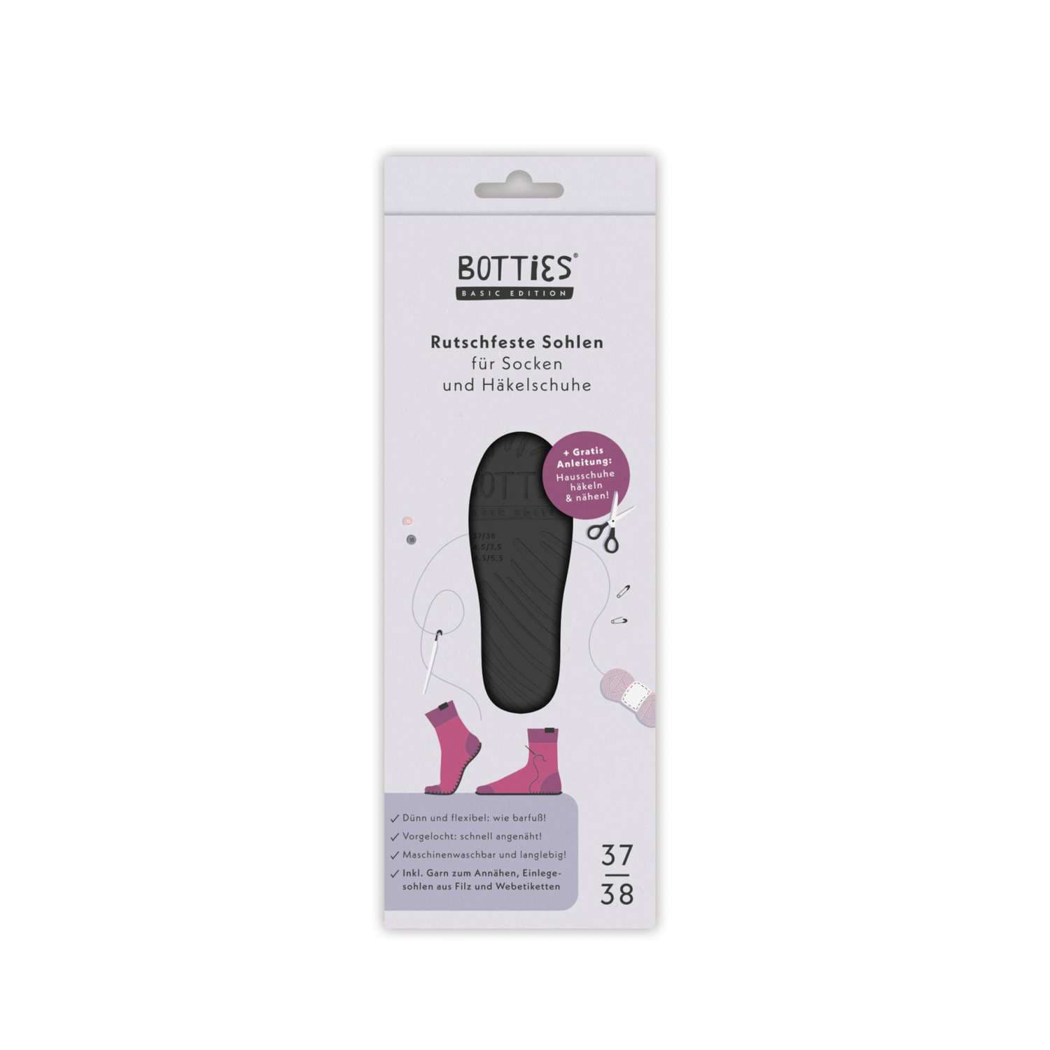 Les semelles myboshi Botties Basic Edition sont disponibles en tailles différentes pour chaque taille de pied. Utilisez des laines et des couleurs différentes pour accorder vos chaussons à la saison ou à votre propre goût individuel.