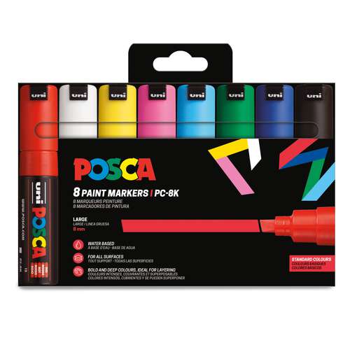 Coffret de marqueurs PC-8K UNI POSCA, contenant 8 ou 16 marqueurs à la pointe large biseautée de 8 mm, encre à base aqueuse.