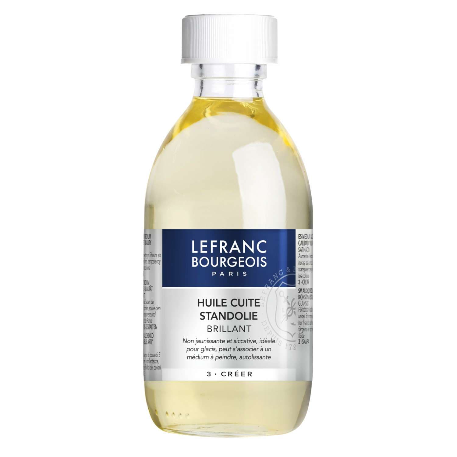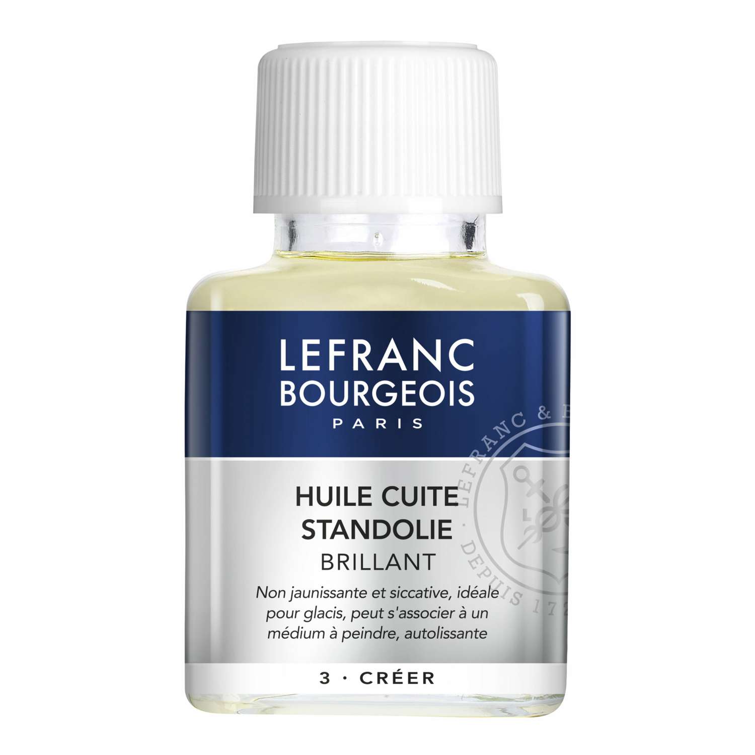 Standolie de lin : L’huile cuite (polymérisée) permet d’arrondir la touche, non jaunissante, elle favorise la brillance et permet de réaliser des glacis