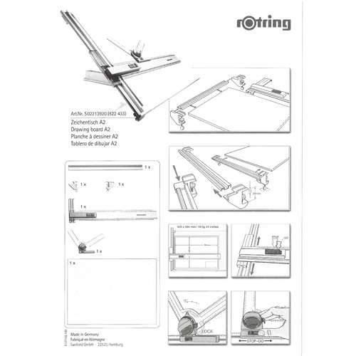 Table à dessin rOtring complète, hauteur d'une inclinaison réglable. La règle parallèle coulissante présente des deux cotés une rainure qui permet de fixer de nombreux accessoires de dessin sur la table. La table à dessin est livrée avec une tête à dessin amovible (ref. 21167). Elle présente, de même que la tête à dessiner, un système de blocage précis.