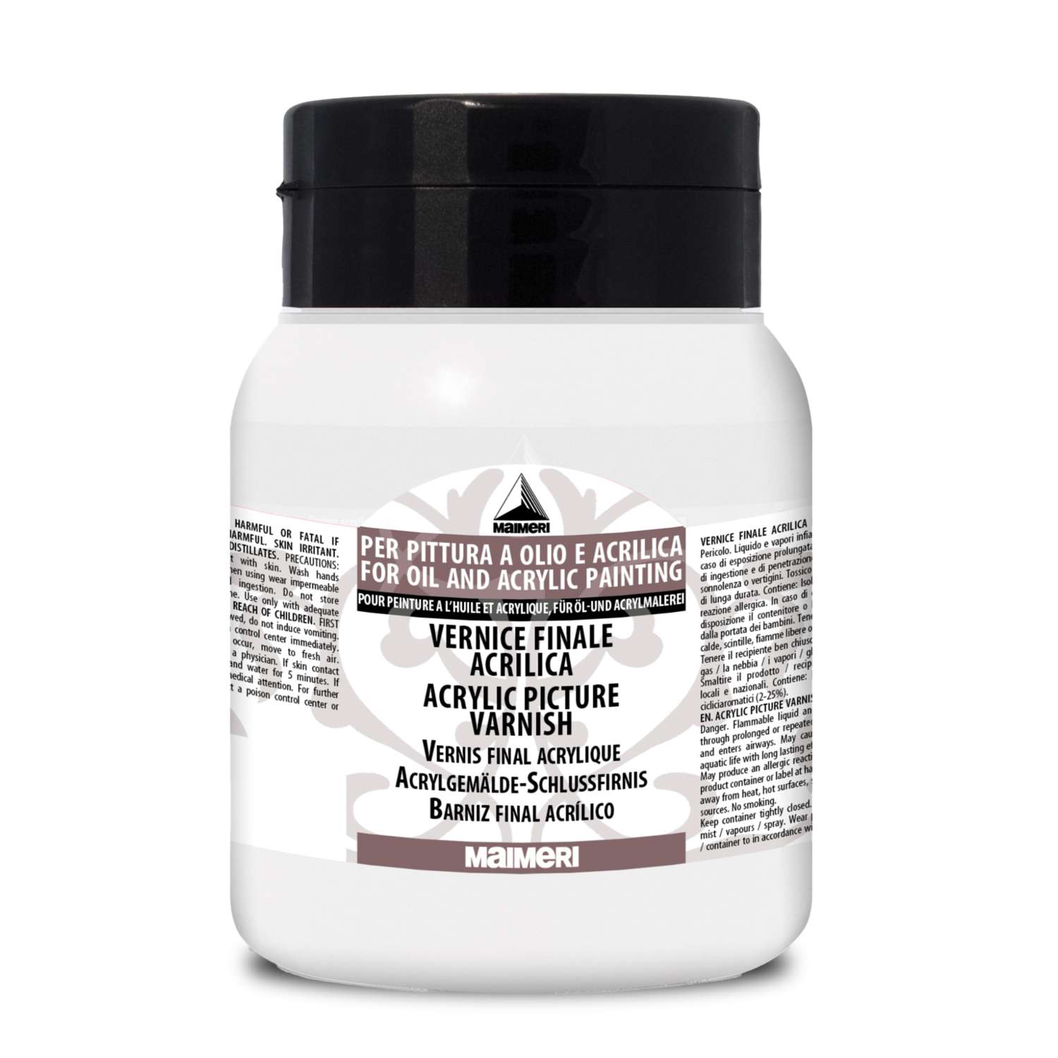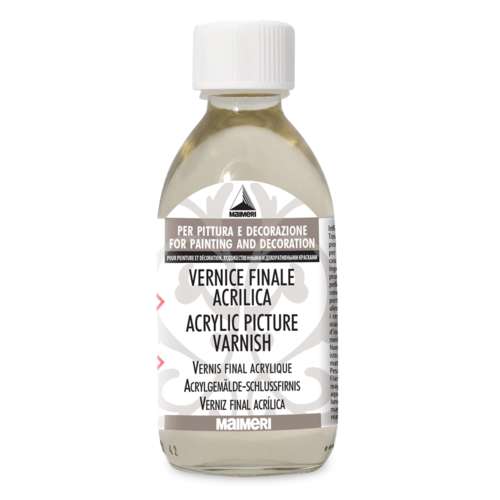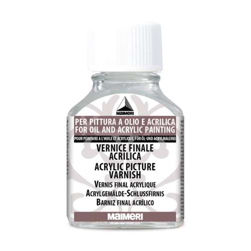 Vernis final brillant Maimeri pour peinture acrylique. Protection UV, ne jaunit pas, intensifie les couleurs, usage intérieur et extérieur. Plus