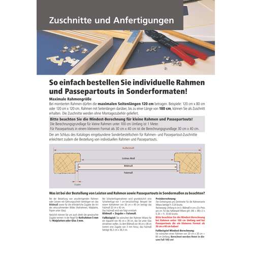 Attention petits cadres : veuillez noter que la quantité minimum de 100 cm sera prise en considération pour les cadres dont le pourtour est plus petit que 100 cm.