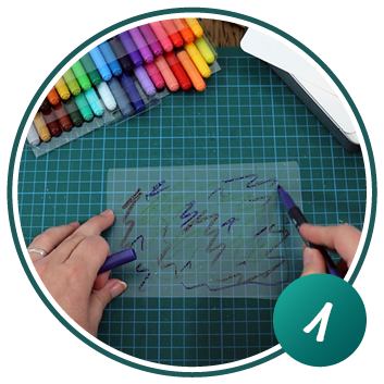 Wie bei Variante 1 mit den Aquarellstiften auf das Stück Plastikfolie malen.