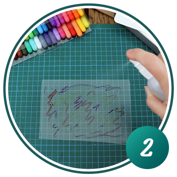 Auch hier wird die bemalte Folie anschliessend grosszügig mit Wasser besprüht.