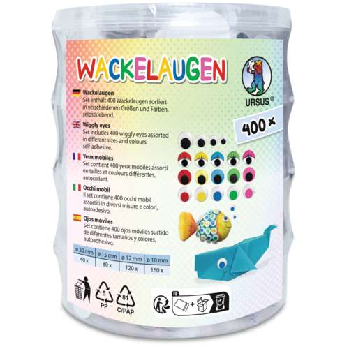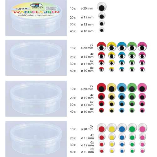 Les yeux mobiles URSUS sont des accessoires parfaits pour vos travaux de bricolage. Le set URSUS contient 400 yeux mobiles assortis en tailles et couleurs différentes dans 4 boîtes empilables.