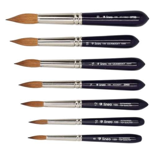 Les pinceaux lineo Série 199 Travel utilisent la meilleure martre rouge Kolinsky, montée à la main par des fabricants de pinceaux expérimentés sur un manche extra court, ce qui permet de gagner de la place.