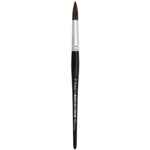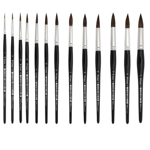 Klassischer Rundpinsel aus weichem Fehhaar für Aquarell, hohe Farbaufnahme, gleichmäßige Abgabe, feine Spitze für Details und fließende Verläufe, handgefertigt in Deutschland.