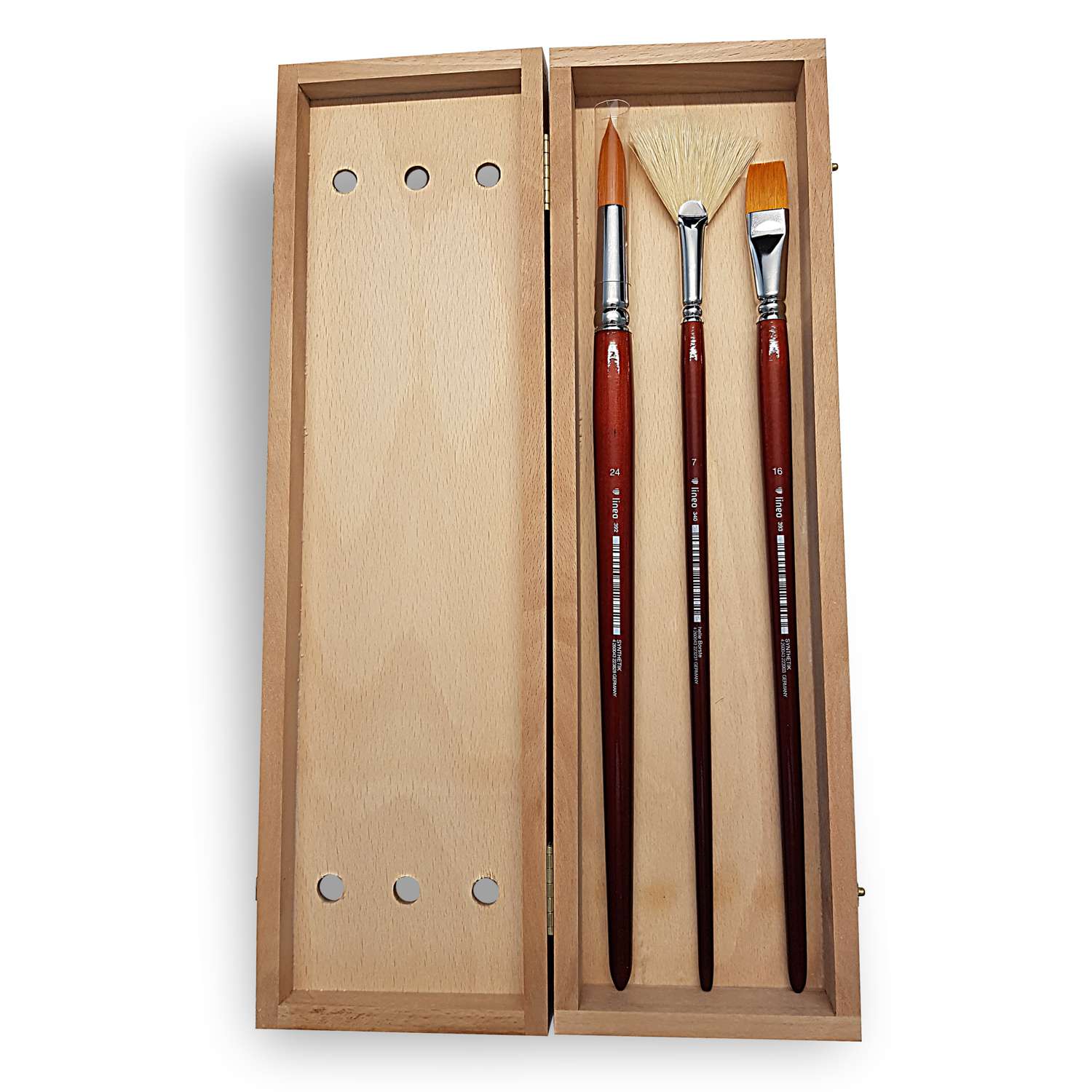 Die lineo Pinselbox enthält eine Auswahl von 3 hochqualitativen Öl- und Acrylpinseln in verschiedenen Formen und Größen. Präsentiert in einer hochwertigen Holzbox. Ideal für den Transport und die Aufbewahrung.