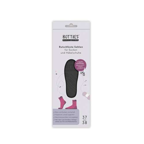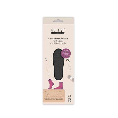 Das Sohlen gibt es in verschiedenen Größen, sodass es für jeden Fuß ein passendes Botties-Set gibt. Nutzen Sie verschiedene Wollarten und Farben und bauen Sie ein kunterbuntes Sortiment an Haussocken und Pantoletten für jede Jahreszeit auf.